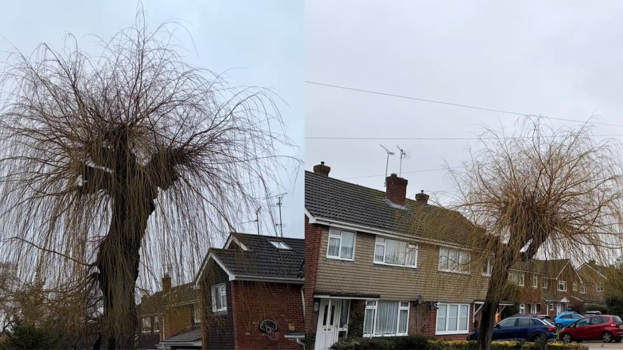 A little job today. We’ve got Oli and Flynn out on site and they’re repollarding some willows. So this willow has a strange look about it because it’s been pollarded many times by us. It’s actually totally hollow. So repollarding it saves the tree. There is also a second one, two doors down, which has also been pollarded by us many times.
